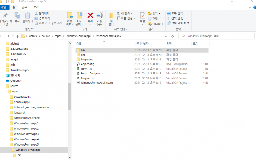 그후 4번이미지와 같이 " 파일탐색기에서 폴더열기" 를 눌러주면 5번이미지 처럼 폴더가 열리는데 그폴더에서 bin 폴더로 들어가면 DEBUG와 RELEASE 로 각각 폴더가