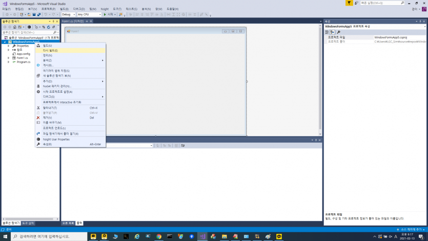 빌드는 3번 이미지와 같이 솔루션이라고 뒤있는 바로 밑에 window 로 시작하는 부분을 우클릭해서 "다시빌드" 눌러주면 된다.