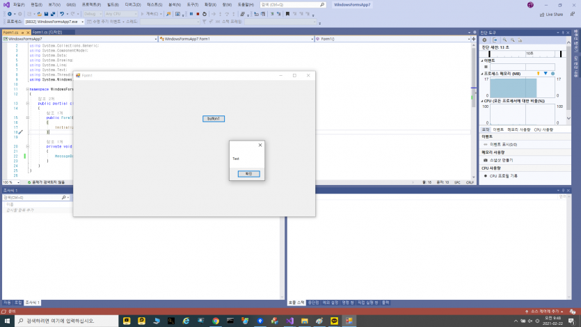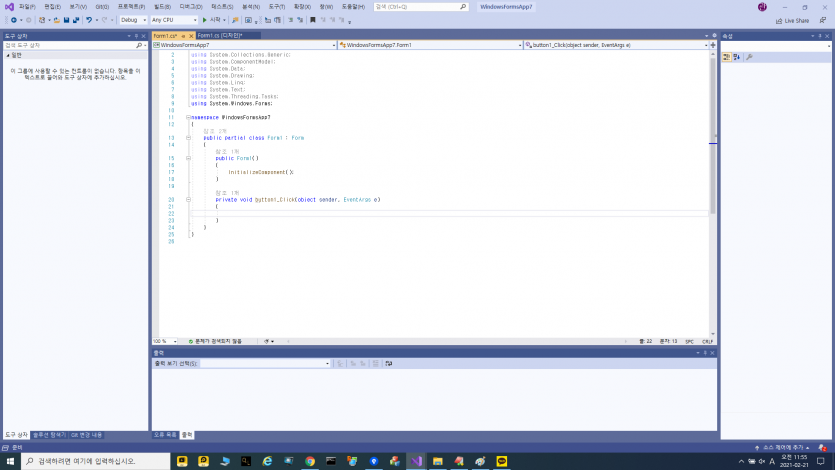 이상태에서 F5(기본설정시) 나 위쪽의 시작 버튼 또는 왼쪽의 프로젝트에서 우클릭해서 디버그> 새인스턴스시작 등으로 프로그램을 빌드하고 실행해보자.