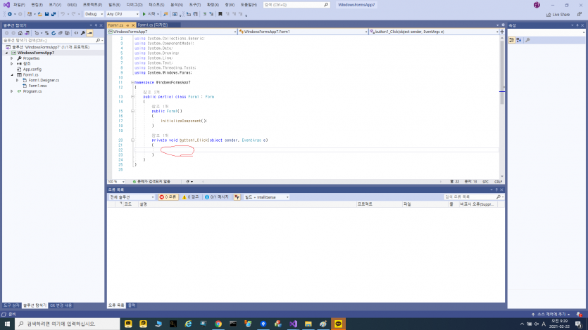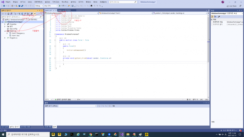 7번이미지의 빨간색내부 코드 바깥에 { } 로 쌓여있는부분에 보면 button1_Click 라고 되있다.