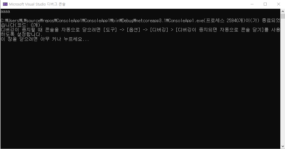 만약 이 코드가 없다면 창이 바로 닫혀서 아무결과를 확인할수 없다.