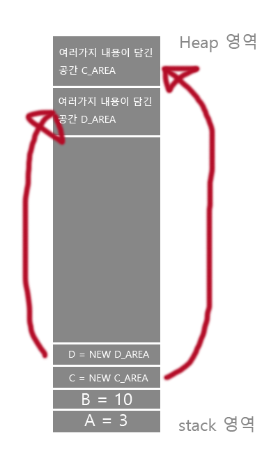 그림2 전체는 메모리 공간을 나타내는데 하나의 값으로 메모리에 적어놓고 사용해야하는것은 stack 영역에 아래에서부터 쓰여지고 하나의 값이 아닌 여러가지 데이터와 값을 가지는 큰덩어리는 heap 영역에 위에서부터 쓰여진다고 생각하면 된다.