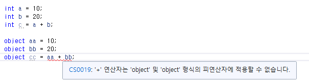 왜냐하면 object 는 무엇이든 될수 있기때문에 컴파일러는 두개의 오브젝트를 더하는 행위가 실제 숫자연산인지 문자열 더하기 인지 알수 없게 되버리기 때문이다.