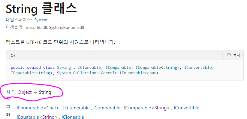 그림1 에서 보면 알수 있겠지만 string 은 object 를 상속받기때문에 object 의 특성을 그대로 가지고 있고 object 로 형변환도 가능하다.
