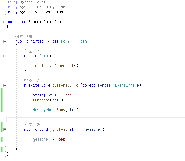 버튼이 클릭되는 순간 str1 변수에 "aaa" 를 대입하고 functest 를 실행한 후에 MessageBox 를 실행한다는 말이다.