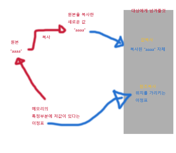 그림2에서 왼쪽에 aaaa 라는 string 원본이 있다고 생각하고 보면 위쪽 화살표는 aaaa 자체를 복사해서 대상에게 넘겨준다.