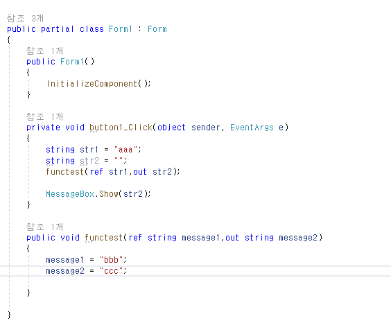 위 그림3을 보면 파라미터로 str1 을 넘기는곳과 받는곳 모두 ref 를 앞에 붙여줬는데 이경우 참조복사로 변경되어 최종결과값이 "bbb" 로 출력된다.