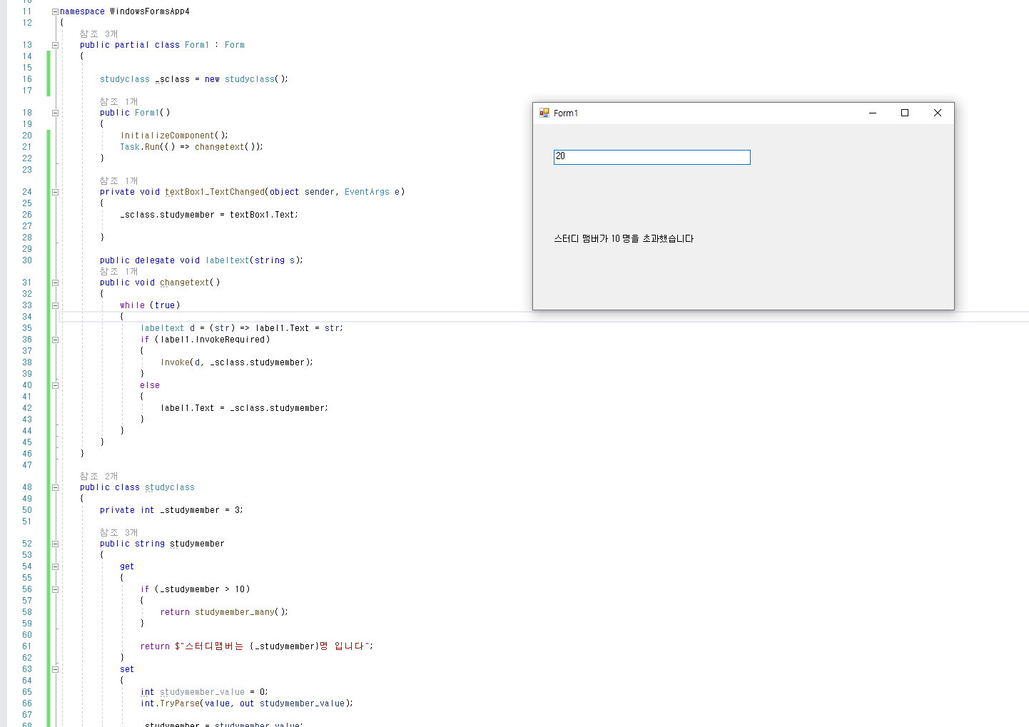 그림3은 N쓰레드 에서 M쓰레드에서 만들어진 studyclass 클래스의 객체의 _studymember 를 계속 바라보면서 해당값이 변경되는순간 N쓰레드에서 M쓰레드의 라벨값을 변경해주는 예제이다.