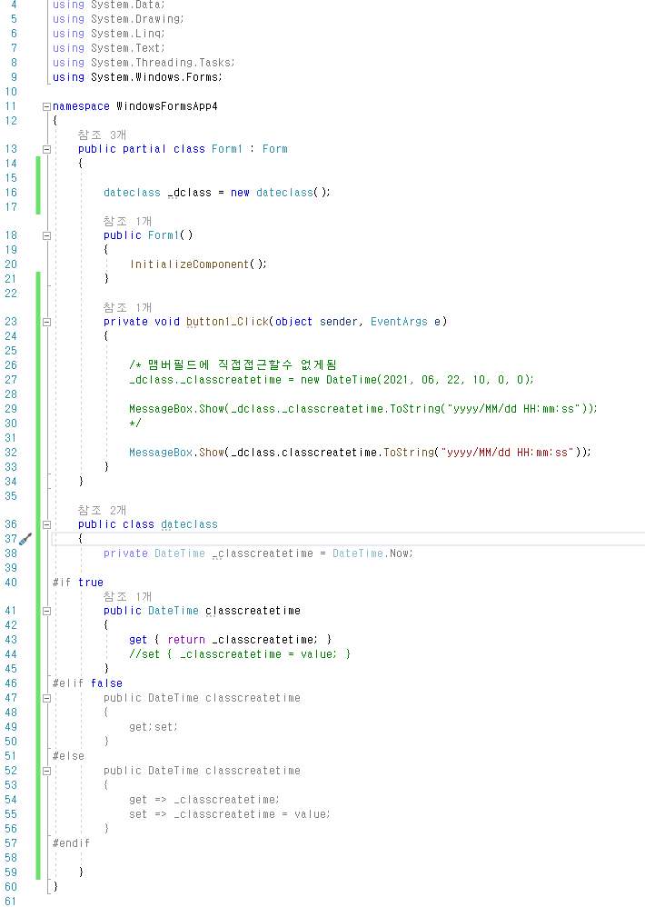이런경우 그림2처럼 맴버필드는 private 으로 변경하고 속성은 get 만 놔둔다면 위와같은 문제는 발생하지 않을것이다.