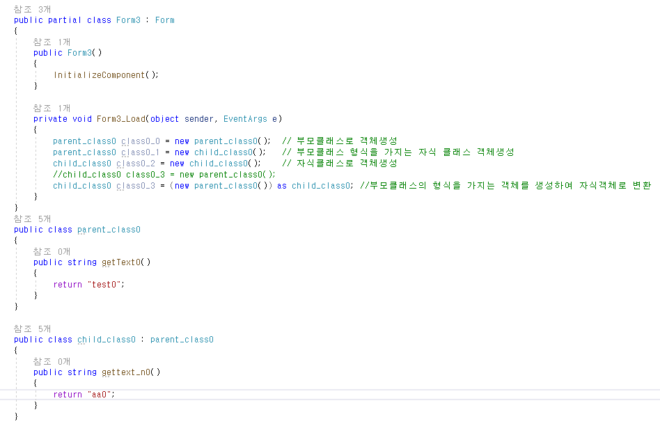 child_class0 class0_3 = (new parent_class0()) as child_class0; // 부모클래스의 형식을 가지는 객체를 생성하여 자식객체로 변환