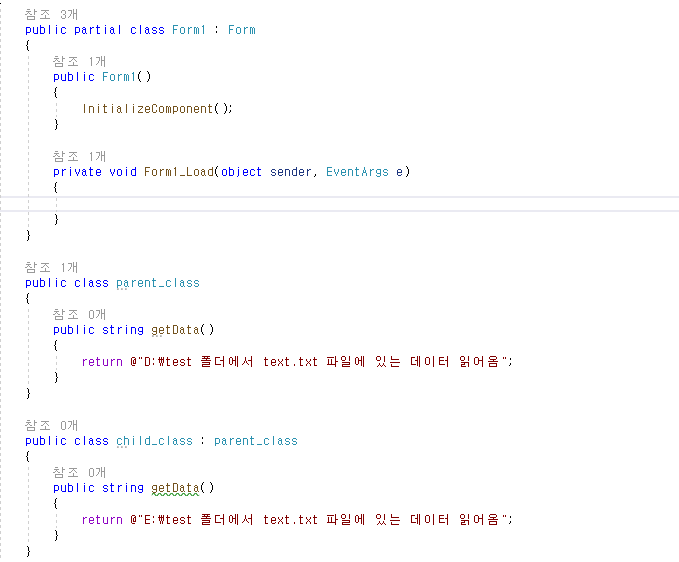 예를 들면 부모클래스에서는 getData() 라는 호출하면 D드라이브의 특정경로에서 파일을 읽어오게 만들놨는데 해당클래스를 상속받아서 다른사람이 만드는중에 D 드라이브가 없어 데이터 읽어오는 위치를 다른드라이브로 변경해야 하는경우가 발생할수 있다.