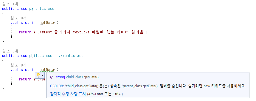 위와 같이 상속받은 클래스에서 동일한 함수명을 써놓으면 new 키워드를 사용하라고 뜬다.