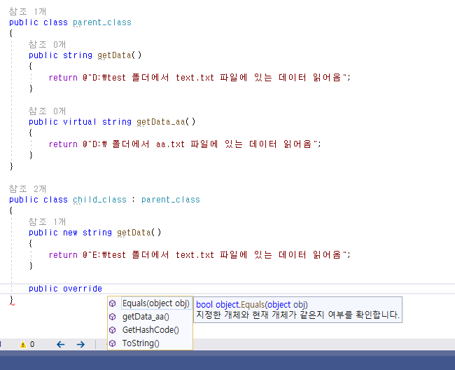 그림4에서 보면 parent class 에서 getdata_aa() 라는 메서드를 virtual 로 정의 하고 상속받은 child class 에서 public override 까지만 입력하고 스페이스만 누르면 위그림처럼 사용가능한 virtual 메서드를 선택할수 있게 된다.