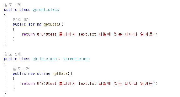 또한 virtual 메서드는 그림5처럼 base 를 없애고 완전히 새로운 내용을 정의해서 사용하거나 new 로 재정의해서 사용할수도 있다.