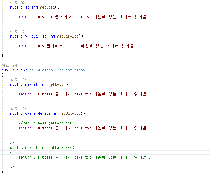 최초 생성시 virtual 을 붙여주면 상속받은 클래스에서 override 를 사용해서 해당 메서드를 수정해서 사용할수있다.
