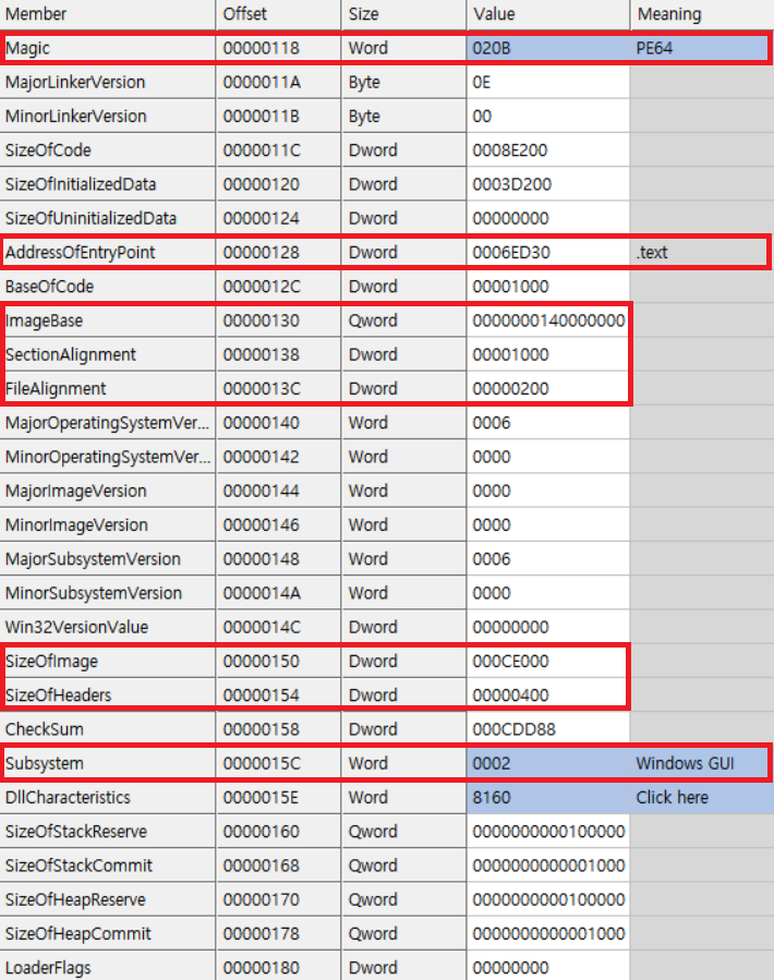 - Magic : 64bit인 경우 0x020B를 가지며 IMAGE_OPTIONAL_HEADER64를 의미