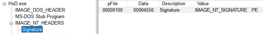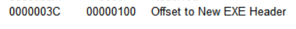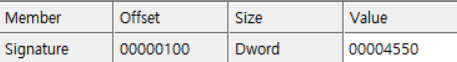 - NT Header가 시작되는 위치의 옵셋을 나타내는 Offset to New EXE Header(e_lfanew)의 값이 0x100으로 세팅