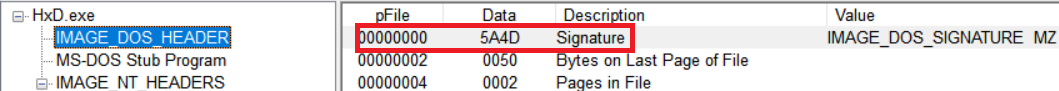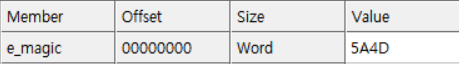 - PE파일을 나타내는 Signature(e_magic)의 값이 5A4D로 세팅