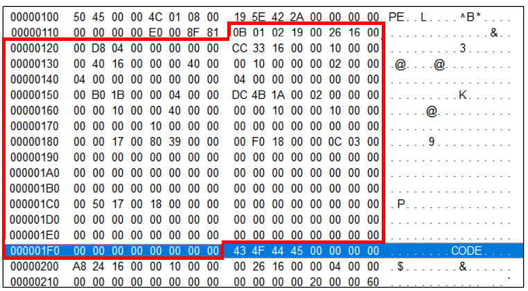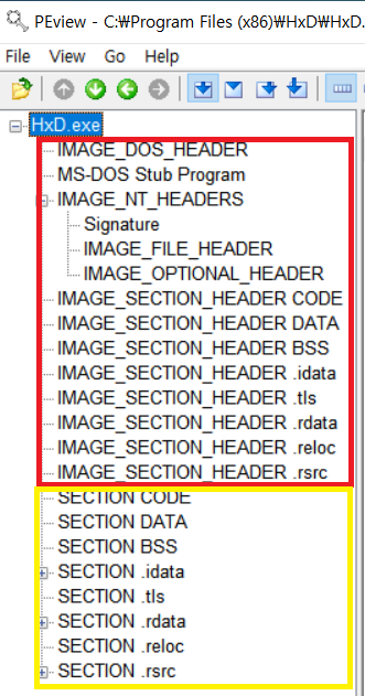 - 빨간색 박스는 PE파일의 Header, 노란색 박스는 Body