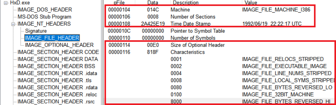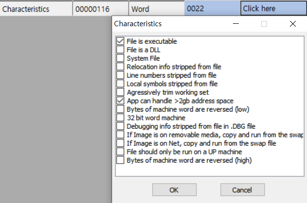- Characteristics : 파일의 속성을 나타내는 값으로 bit OR연산을 통해 최종적으로 0x818F값으로 설정된 것을 볼 수 있으며 속성 값 중에 0x0002가 존재함을 통해 exe파일임을 확인