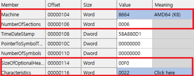 ① Machine : 파일의 실행 대상 플랫폼을 나타냄(winnt.h에 정의됨) I386(0x014C), IA64(0x200), AMD64(0x8664)