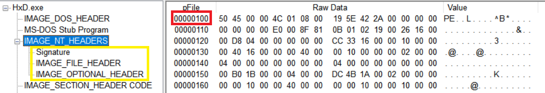 - IMAGE_DOS_HEADER의 멤버 중 NT Header가 시작되는 위치의 옵셋을 나타내는 멤버의 값이 0x100이라 세팅되어 있는대로 IMAGE_NT_HEADERS의 시작 위치 세팅(빨간색 박스)