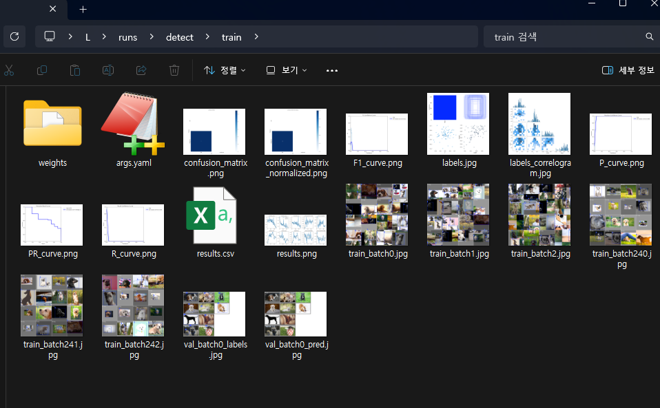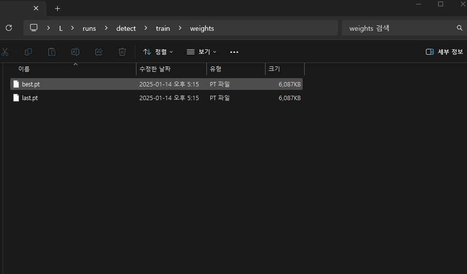 위와 같이 weights 폴더에 들어가면 best.pt 라고 되있는 파일이 있는데 해당 파일이 학습된 최종 모델 파일이다.