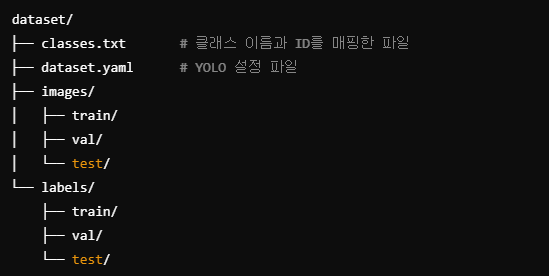 dataset 라는 폴더를 만들고 그안에 images 와 labels 폴더가 위치해야하고 각가의 폴더내에는 train val test 폴더와 이미지 및 이미지에 대한 라벨링 파일도 필요하다.