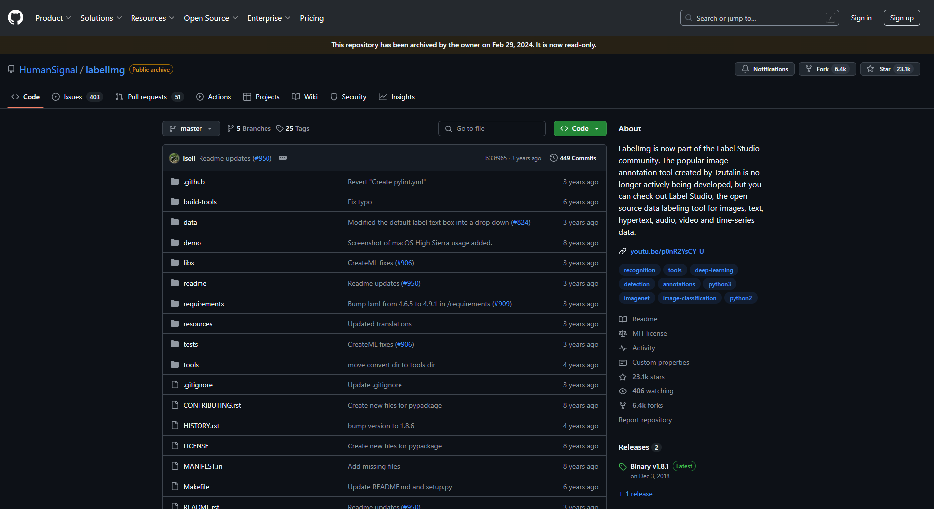 위 라벨링 작업을 편하게 할수 있는 labelImg 라는 프로그램인데 https://github.com/HumanSignal/labelImg 해당경로로 들어가면된다.
