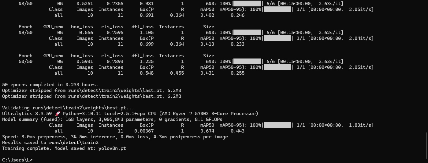 우측하단에 있는 mAP50 역시 0.5 이상이 일반적으로 좋은 성능으로 간주된다고 하는데 해당수치역시 학습량이 적어 결과가 좋지는 않은 편이다.
