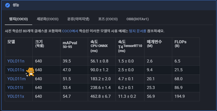 스크롤을 내리다보면 위와 같은 화면이 있는데 각 욜로 모델에 대한 성능이 나와있다.