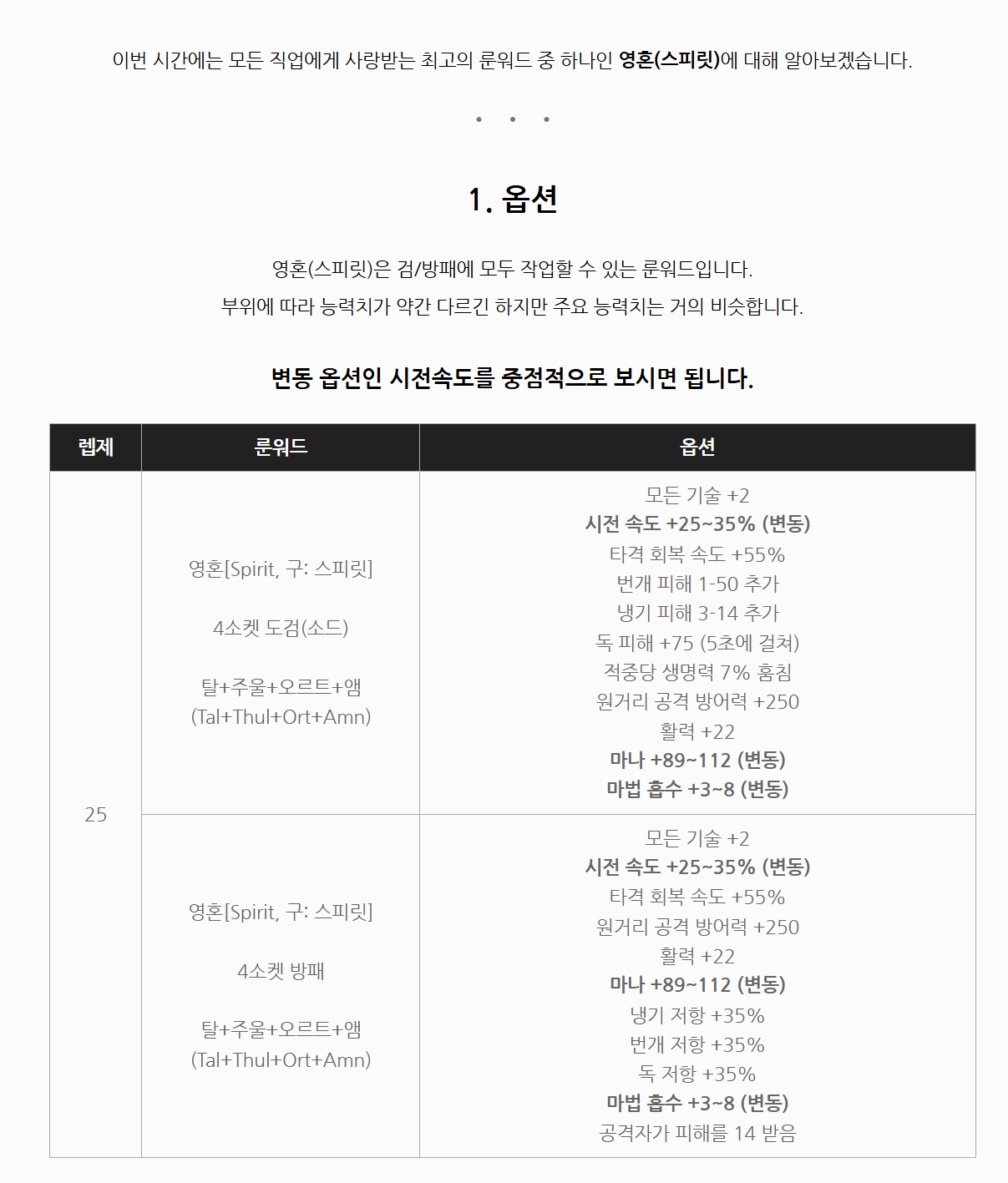 이번 시간에는 모든 직업에게 사랑받는 최고의 룬워드 중 하나인 영혼(스피릿)에 대해 알아보겠습니다. 1. 옵션 영혼(스피릿)은 검/방패에 모두 작업할 수 있는 룬워드입니다. 부위에 따라 능력